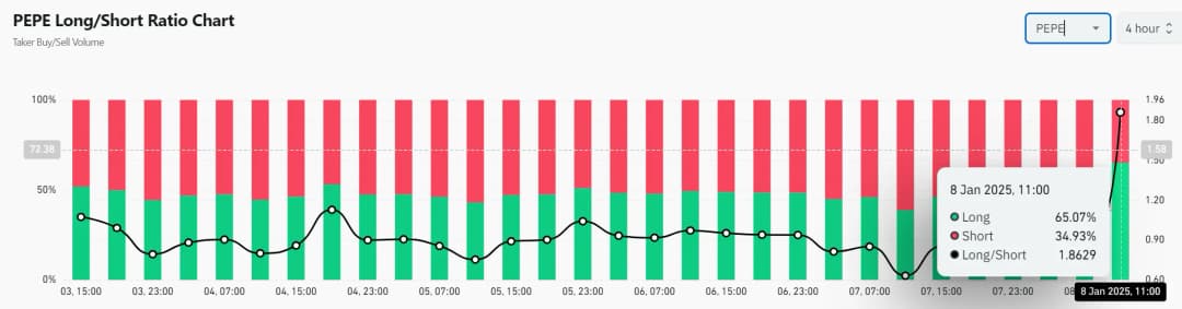 با بررسی نسبت لانگ/شورت، ۶۵.۰۷٪ از موقعیتها لانگ هستند که نشاندهنده احساسات صعودی است. این تمایل به لانگ، همراه با فعالیت اخیر نهنگها، نشاندهنده پتانسیل عبور این میم کوین از سطوح مقاومت کلیدی است. با این حال، اگر احساسات تغییر کند و فروشندگان غالب شوند، حرکت صعودی میتواند متوقف شود. موفقیت رالی PEPE به ادامه علاقه خرید و غلبه بر مقاومت بستگی دارد.