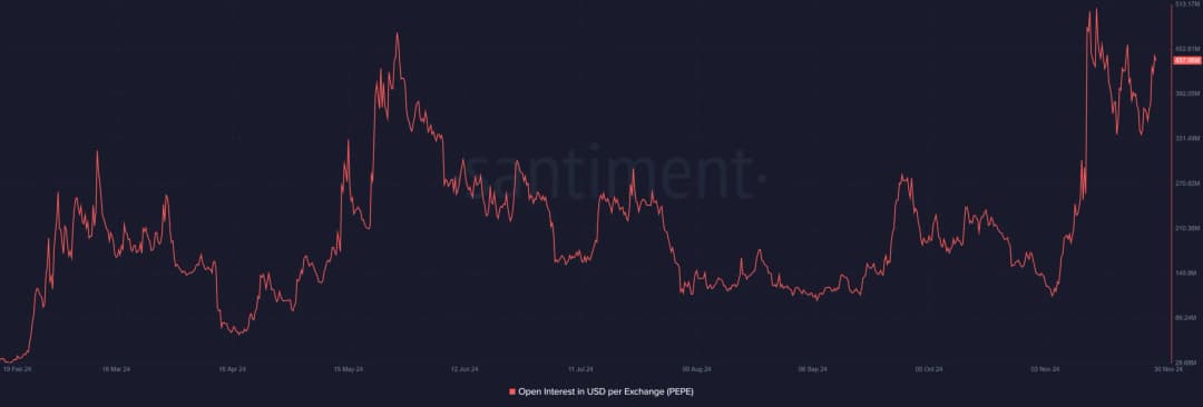 فعالیت بازار پیرامون Pepe به طور قابل توجهی بالا بود. دادههای Santiment نشاندهنده افزایش آدرسهای فعال روزانه است که در اوایل ماه به اوج خود رسید. نمودار آدرسهای فعال روزانه نشاندهنده افزایش به بیش از ۲۸۰۰۰ در حدود ۱۴ نوامبر بود. اخیراً، کاهش جزئی در آدرسهای فعال مشاهده شده که ممکن است نشاندهنده برداشت سود توسط برخی سرمایهگذاران باشد. در زمان نگارش این مقاله، این تعداد حدود ۲۸۰۰ است. با وجود این کاهش، نمودار بهره باز (OI) همچنان قوی است که نشاندهنده علاقه پایدار معاملهگران مشتقات است. نمودار OI افزایش جزئی به بیش از ۴۳۷ میلیون دلار را نشان میدهد. این ترکیب دادهها نشاندهنده احساسات مختلط است؛ با مشارکت قوی کوتاهمدت اما احتیاط نسبت به نوسانات میانمدت.