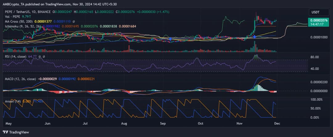 نمودار روزانه Pepe نشاندهنده یک روند صعودی پایدار است. قیمت در زمان نگارش این مقاله حدود $0.000002076 بود. تقاطع میانگین متحرک (50، 200) یک الگوی صعودی تقاطع طلایی را نشان میدهد که حاکی از ادامه حرکت صعودی است. شاخص قدرت نسبی (RSI) در 64.77 و نزدیک به محدوده اشباع خرید قرار دارد. این موضوع نشاندهنده علاقه شدید خریداران است، اما به دلیل احتمال اصلاح قیمت، نیاز به احتیاط نیز وجود دارد.