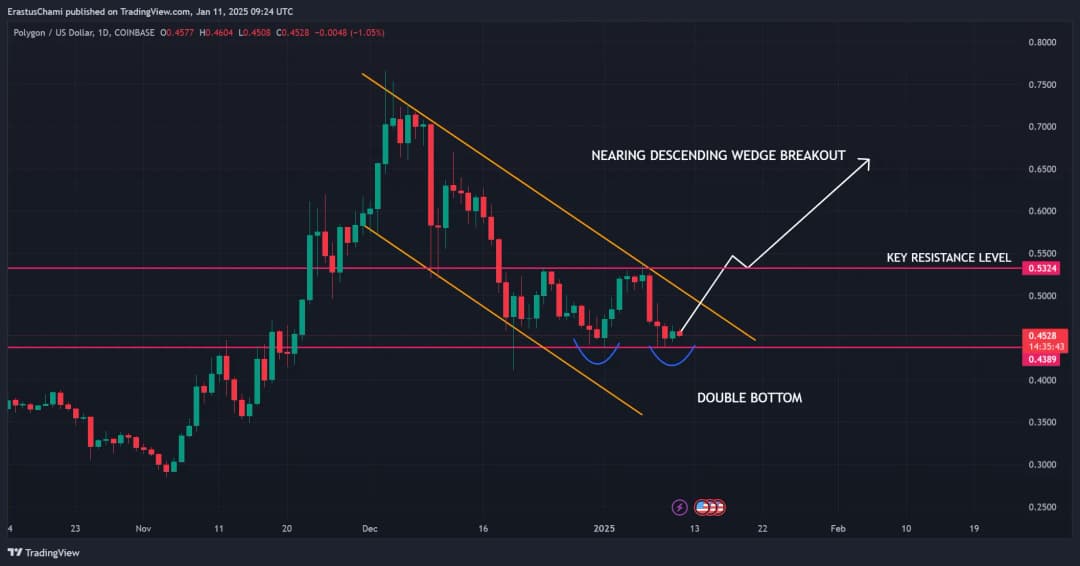 حرکت قیمتی POL الگوی یک کنج نزولی را نشان میدهد که یک الگوی کلاسیک برای بازگشت صعودی است. تشکیل الگوی کف دوقلو در نزدیکی ۰.۴۳۸۹ دلار نیز از بازگشت قیمت حمایت میکند. اگر POL بتواند بالاتر از سطح مقاومت ۰.۵۳۲۴ دلار تثبیت شود، میتواند یک رالی صعودی قابل توجه را آغاز کند. با این حال، این توکن باید فشار خرید مداوم را حفظ کند تا از روند نزولی خارج شود.