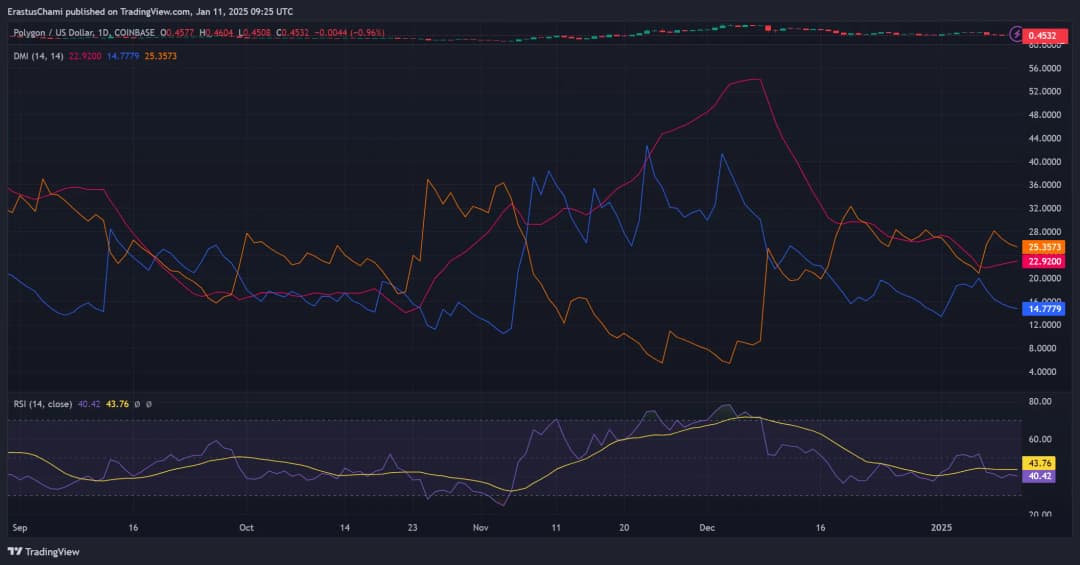 شاخص قدرت نسبی (RSI) POL در ۴۳.۷۶ قرار دارد که نشاندهنده نزدیکی به منطقه اشباع فروش است و اغلب قبل از افزایش قیمت رخ میدهد. علاوه بر این، شاخص حرکت جهتدار (DMI) با +DI برابر ۱۴.۷۷، -DI برابر ۲۵.۳۵ و ADX برابر ۲۲.۹۲، نشاندهنده تضعیف روند نزولی است. بنابراین، اگر +DI بالاتر از -DI قرار گیرد، میتواند یک تغییر روند را شکل دهد و احتمال حرکت صعودی را تقویت کند.