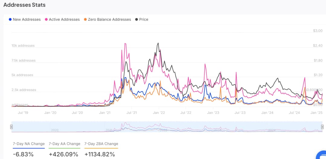 فعالیت شبکه پالیگان به طور قابل توجهی افزایش یافته و آدرسهای فعال در هفت روز گذشته ۴۲۶ درصد رشد داشتهاند. علاوه بر این، آدرسهای با موجودی صفر نیز ۱۱۳۴.۸۲ درصد افزایش یافتهاند که نشاندهنده تعامل بیشتر کاربران با شبکه است. اگرچه تعداد آدرسهای جدید ۶.۸۳ درصد کاهش یافته، اما افزایش کاربران فعال نشاندهنده علاقه قوی به قابلیتهای این پلتفرم است. در نتیجه، این گسترش شبکه، آلتکوین مذکور را برای حرکت صعودی بالقوه آماده کرده است.