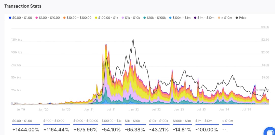 آمار تراکنشهای پالیگان نیز تغییرات جالبی را نشان میدهد. تراکنشهای خرد بین ۰ تا ۱۰ دلار به ترتیب ۱۴۴۴ درصد و ۱۱۶۴.۴۴ درصد افزایش یافتهاند که نشاندهنده مشارکت بیشتر کاربران خرد است. در همین حال، تراکنشهای بزرگتر از ۱۰۰۰ دلار به طور قابل توجهی کاهش یافتهاند و تراکنشهای بین ۱۰۰۰ تا ۱۰۰۰۰ دلار ۶۵.۳۸ درصد کاهش داشتهاند. در نتیجه، افزایش تراکنشهای کوچکتر نشاندهنده رشد استفاده از شبکه در موارد کاربرد روزمره است.