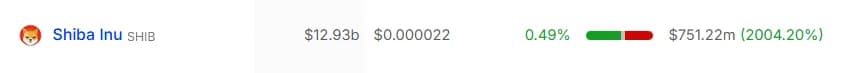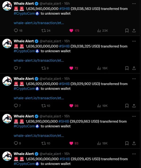 این تثبیت نزدیک به سه روز طول کشید که در طی آن یک نهنگ احتمالی، ۸.۱۸ تریلیون سکه SHIB به ارزش ۱۹۵.۱ میلیون دلار را از صرافیهای CryptoCom به یک کیف پول منتقل کرد. این انتقال در حالی انجام شد که بازار کلی در حال صعود بود و پایدار باقی ماند.