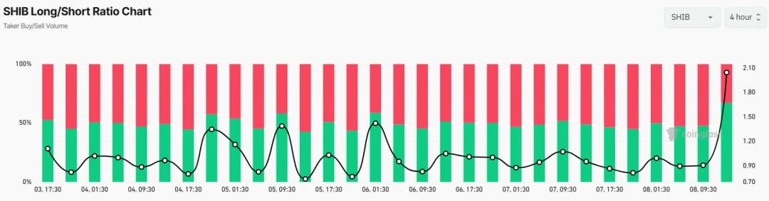 در همین دوره، شرکت تحلیل دیگری به نام Coinglass فاش کرد که صرافیها شاهد خروج ۷.۰۴ میلیون دلار سکه SHIB بودند. این دادهها نشاندهنده انباشت احتمالی این میم کوین است، زیرا کاهش قیمت آن بیش از ۱۰٪ بوده و سرمایهگذاران و دارندگان بلندمدت را جذب کرده است. علاوه بر نهنگها، سرمایهگذاران و دارندگان بلندمدت، معاملهگران نیز نسبت به این میم کوین خوشبینتر به نظر میرسند. نسبت لانگ/شورت SHIB در Coinglass برابر با ۲.۰۴ است که بالاترین میزان از ابتدای سال ۲۰۲۵ است و نشاندهنده احساسات صعودی قوی در میان معاملهگران است. در حال حاضر، ۶۷.۱۶٪ از معاملهگران برتر در موقعیتهای لانگ هستند، در حالی که ۳۲.۸۴٪ در موقعیتهای شورت قرار دارند که نشاندهنده چشمانداز بسیار صعودی است.
