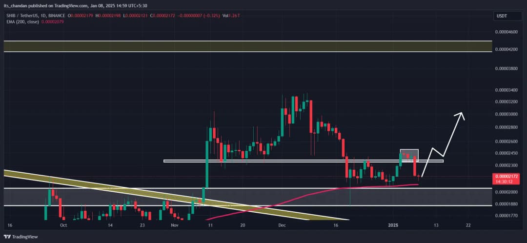 با ترکیب همه این معیارهای زنجیرهای، به نظر میرسد که گاوها در حال حاضر بر این دارایی تسلط دارند و به زودی میتوانند باعث بازگشت قیمت SHIB شوند. طبق تحلیل تکنیکال AMBCrypto، کاهش قیمت اخیر، SHIB را به یک سطح حمایت افقی مهم و میانگین متحرک نمایی ۲۰۰ (EMA) در بازه زمانی روزانه رسانده است. این موقعیت SHIB را برای حرکت صعودی بالقوه امیدوارکننده میکند.
