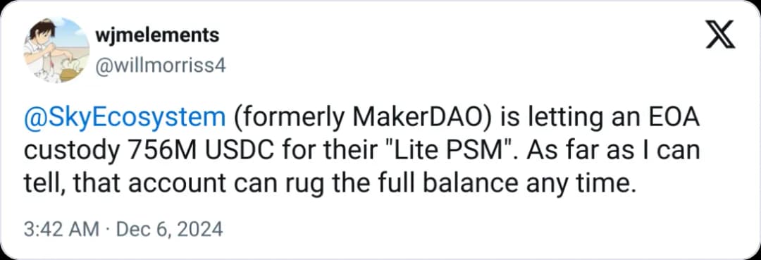 Sky، که قبلاً به عنوان MakerDAO شناخته میشد، به دلیل استفاده از یک حساب تحت کنترل خارجی (EOA) برای مدیریت ۷۵۶ میلیون دلار از ذخایر USD Coin خود در ماژول سبک تثبیت قیمت (PSM) با انتقادات مواجه شده است. یک کاربر در شبکه اجتماعی X نگرانیهایی را در مورد وابستگی این پروتکل به یک EOA برای مدیریت بخش قابل توجهی از ذخایر خود مطرح کرده است. منتقدان معتقدند این مدل نگهداری میتواند وجوه را در معرض سوءاستفادههای احتمالی یا استفاده نادرست داخلی قرار دهد.