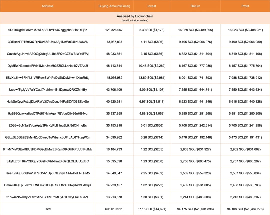 حداقل ۱۵ کیف پول بلاکچینی که به معاملات داخلی مشکوک هستند، سرمایه اولیه ۱۴,۶۰۰ دلاری خود را به بیش از ۲۰ میلیون دلار تبدیل کردهاند که نگرانیهایی درباره شفافیت و عدالت در بازارهای کریپتو ایجاد کرده است. این کیف پولها بیش از ۲۰ میلیون دلار سود از توکن Focai.fun (FOCAI)، یک میم کوین که اخیراً در بستر سولانا راهاندازی شده، به دست آوردهاند. این کیف پولها بیش از ۶۰.۵٪ از کل عرضه توکن را خریداری کردند و سپس تمام توکنهای خود را فروختند و ۹۴,۱۰۸ SOL (۲۰.۴۸ میلیون دلار) سود خالص به دست آوردند.