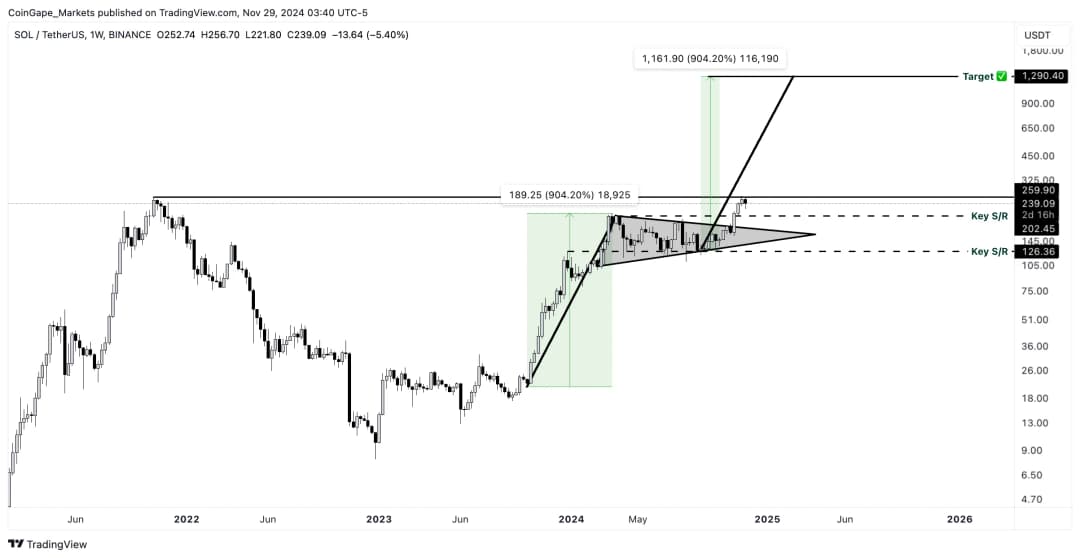 سولانا با یک الگوی تکنیکال جذاب، توجه بازار کریپتو را به خود جلب کرده است که نشاندهنده سودهای بالقوه است. تحلیلگران به یک الگوی مثلث متقارن صعودی اشاره میکنند که معمولاً نشاندهنده ادامه روند فعلی است. قیمت SOL در حال حاضر ۲۴۲ دلار است و ۴٪ افزایش داشته است. مقاومت در ۲۵۹ دلار به عنوان یک نقطه شکست محوری برای پیشبینی قیمت سولانا عمل میکند. بسته شدن پایدار بالای این سطح میتواند مسیر صعودی را تأیید کند. از سوی دیگر، مناطق حمایت حیاتی در ۲۴۵ و ۱۲۶ دلار قرار دارند. شکست زیر این سطوح، چشمانداز صعودی را باطل کرده و نشاندهنده یک تغییر احتمالی در احساسات بازار است. خوشبینی کلی بازار به حرکت سولانا افزوده و نشاندهنده یک صعود ۹۰۰٪ از مرحله تثبیت قبلی آن است. اگر شکست تأیید شود، حرکت اندازهگیری شده به یک هدف بالقوه نزدیک به ۱۳۰۰ دلار اشاره دارد که با الگوهای تاریخی مشاهده شده در تنظیمات مشابه همسو است.
