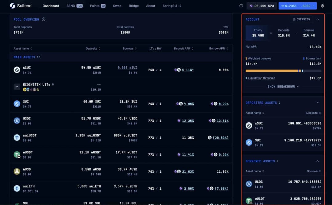 یک دارنده توکن SUI در پلتفرم Suilend مبلغ قابل توجهی در حدود 19.7 میلیون دلار را به استخر وامدهی تزریق کرد و از آن به عنوان وثیقه برای وام گرفتن استیبل کوینها استفاده کرد. این موقعیت در صورتی که قیمت بالای 4.56 دلار باقی بماند از نقد شدن در امان است، اما با توجه به قیمت معاملاتی فعلی، این سناریو به سرعت در حال نزدیک شدن است. کاهش قیمت به زیر این سطح میتواند منجر به نقد شدن موقعیت این نهنگ شود که احتمالاً باعث ایجاد تأثیرات منفی در احساسات بازار و کاهش قیمت به دلیل افزایش ناگهانی عرضه خواهد شد.