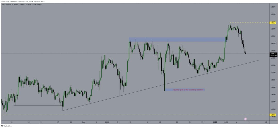 حرکات قیمتی SUI نشاندهنده نوسانات قابل توجهی است و موقعیتهای خرید طولانی در حال غالب شدن هستند. در ابتدا، قیمت SUI در حدود 4.52 دلار بود، اما سپس به بالای 5.36 دلار افزایش یافت که نشاندهنده یک سطح مقاومت قوی است. پس از این اوج، قیمت به شدت کاهش یافت و به سمت سطح 4.52 دلار بازگشت. این الگو یک منطقه حیاتی از خط روند صعودی را تشکیل میدهد که اغلب توسط معاملهگران به عنوان یک منطقه جذب نقدینگی دیده میشود.