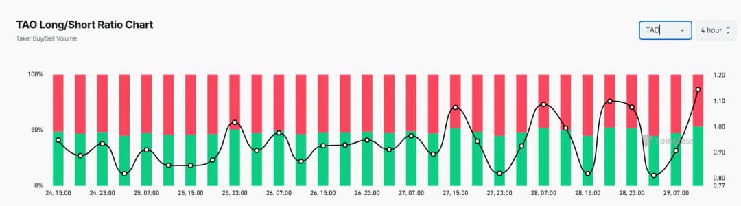 میلههای سبز نشاندهنده افزایش تسلط خریداران است، به ویژه از ۲۷ نوامبر که با فشار صعودی بر قیمت TAO همزمان شده است. کاهشهای قبلی به زیر ۱.۰ در اوایل هفته نشاندهنده تثبیت موقت بود. با این حال، فعالیتهای اخیر که تحت تسلط معاملات لانگ بوده، نشان میدهد که معاملهگران ممکن است برای افزایش بیشتر قیمت آماده شوند.
