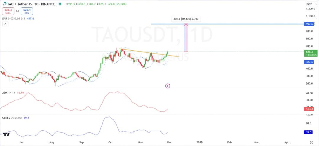 رشد ۹.۸ درصدی Bittensor با عبور از مقاومت نزولی؛ هدف بعدی $۱۰۰۰؟