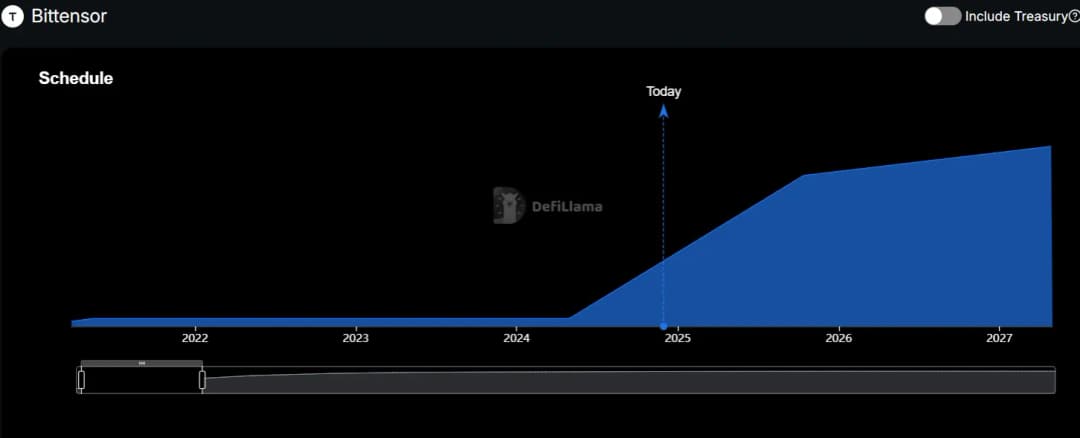 برنامه انتشار توکن TAO که توسط DeFiLlama به تصویر کشیده شده است، نشاندهنده یک انتشار تدریجی و کنترلشده توکنها است که از سال ۲۰۲۵ به طور قابل توجهی افزایش مییابد و تا سال ۲۰۲۷ ادامه دارد. توزیع فعلی آن حداقلی باقی مانده است که نشاندهنده مرحله اولیه پروژه است و امکان توسعه تدریجی اکوسیستم را بدون ایجاد فشار عرضه در بازار فراهم میکند. در واقع، منحنی انتشار توکن نیز نشاندهنده افزایش شدید از سال ۲۰۲۵ است که نشان میدهد بخش قابل توجهی از توکنها طی دو سال وارد گردش خواهند شد.