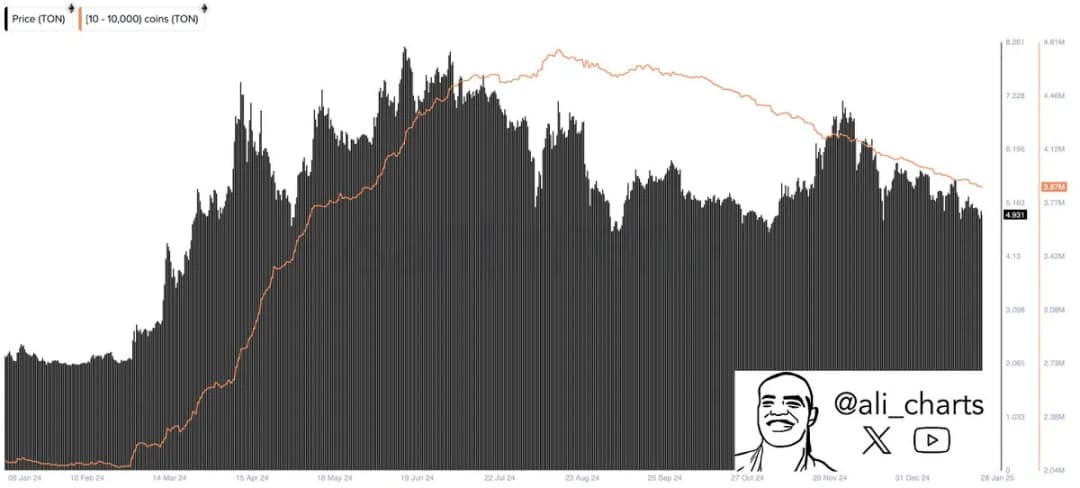 دستگیری پاول دوروف در آگوست ۲۰۲۴ باعث فروش گسترده Toncoin (TON) شد. پس از این اتفاق، بیش از ۸۹۰ هزار TON فروخته شد که نشاندهنده افزایش نوسانات بازار است. علاوه بر این، انتقال اخیر بیش از ۲۴۰ هزار Toncoin به صرافیها در هفته گذشته، فشار فروش را تشدید کرده است. این موضوع نشاندهنده نگرانی سرمایهگذاران است و نشان میدهد که قیمت Toncoin پس از این رویدادها به وضوح در حال کاهش است. تعداد Toncoin های نگهداری شده به شدت کاهش یافت و این موضوع باعث افت قابل توجه قیمت شد. این روند نشان میدهد که TON در صورت ادامه فشار فروش ممکن است با کاهش بیشتری مواجه شود. با این حال، این موضوع میتواند برای کسانی که به بهبود بازار امیدوارند، یک فرصت خرید باشد.