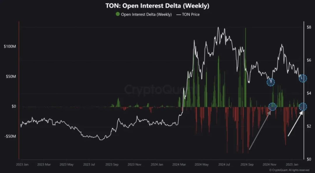 این موقعیت متزلزل، تأثیرات گستردهتر رویدادهای ژئوپلیتیکی بر بازارهای ارز دیجیتال، به ویژه برای داراییهایی مانند Toncoin که مستقیماً با افراد برجسته مرتبط هستند، را نشان میدهد. علیرغم این فروش، دلتا بهره باز (OI) هفتگی TON افزایش نوسانات همراه با رشد OI را نشان داد. به طور تاریخی، این الگو اغلب نشاندهنده افزایش قیمت بوده است. دلتا OI در اواسط ۲۰۲۴ افزایش یافت و قیمت Toncoin به شدت بالا رفت. اخیراً، افزایشهای مشابه در OI در ۲۵ ژانویه ۲۰۲۵ نشاندهنده یک بازگشت احتمالی و روند صعودی بود. اگر این همبستگی حفظ شود، نظارت بر تغییرات OI همراه با حرکات قیمتی میتواند بینشهایی در مورد دینامیک بازار کوتاهمدت TON ارائه دهد. نقدینگی و جریان موقعیتها در تعیین اینکه آیا روند OI میتواند قیمتهای بالاتری را ایجاد کند، حیاتی خواهد بود.