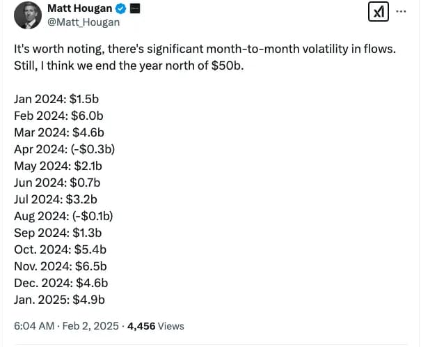 مت هوگان، مدیر سرمایهگذاری Bitwise، نوشت: «تا اینجا خوب پیش رفته: ETFهای بیت کوین اسپات در ژانویه ۴.۹۴ میلیارد دلار جذب کردند که به صورت سالانه معادل ~۵۹ میلیارد دلار است.» او افزود که نوسانات قابل توجهی در جریان ورودی ماه به ماه وجود دارد اما پیشبینی کرد که این ETFها «سال را با بیش از ۵۰ میلیارد دلار به پایان خواهند رساند.»
