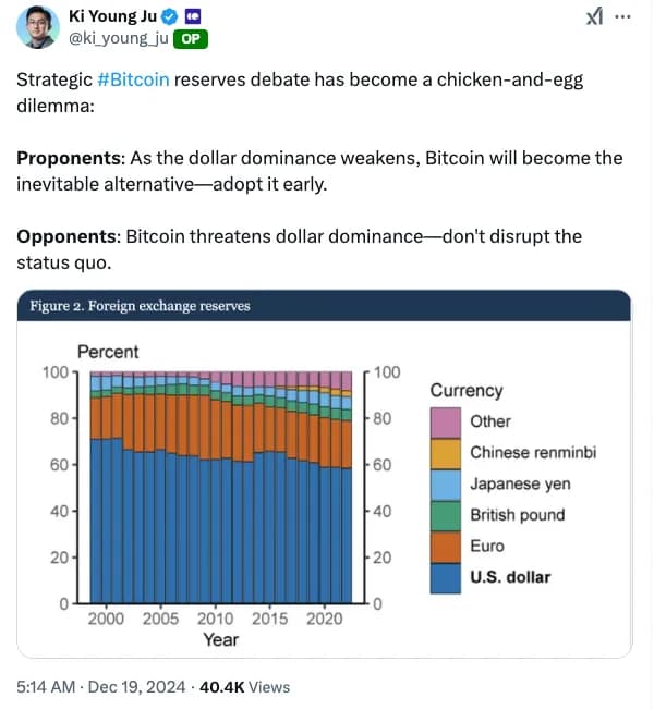 در حالی که برخی، ذخیره بیت کوین را راهحلی برای یک سیستم پولی فیات در حال فروپاشی میدانند، برخی دیگر نسبت به خطرات قابل توجه آن هشدار میدهند. برخی معتقدند این اقدام میتواند دلار را به سمت ابرتورم سوق دهد. دیگران بر این باورند که اگر ایالات متحده اکنون این اقدام را انجام ندهد، ممکن است عقب بماند. کی یانگ جو، بنیانگذار و مدیرعامل شرکت تحلیل آنچین CryptoQuant، این بحث را به یک معمای مرغ و تخممرغ تشبیه کرد: آیا باید بیت کوین را زودتر پذیرفت زیرا دلار در حال تضعیف است یا پذیرش بیت کوین خود میتواند عامل تضعیف دلار باشد؟