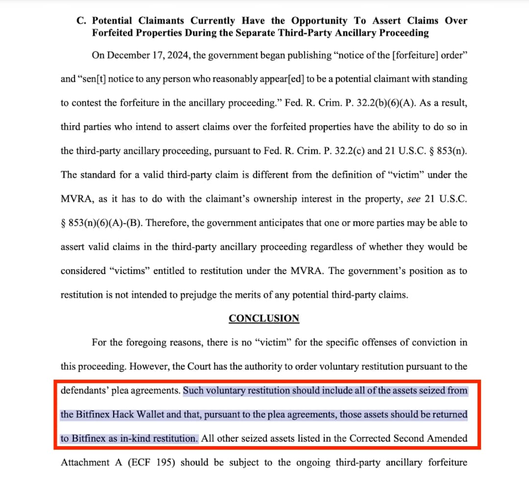 وکلای دولت ایالات متحده اخیراً درخواستی ارائه دادهاند که بیت کوینهای (BTC) توقیفشده در نتیجه هک ۲۰۱۶ Bitfinex به این صرافی بازگردانده شود. در پرونده حقوقی ۱۴ ژانویه، بازگشت تقریباً ۹۴,۶۴۳ بیت کوین و مقادیر نامشخصی از بیت کوین کش (BCH)، بیت کوین ساتوشی ویژن (BSV) و بیت کوین گلد (BTG) که از طریق فورکهای شبکه ایجاد شده بودند، به صورت عینی به صرافی قید شده است.