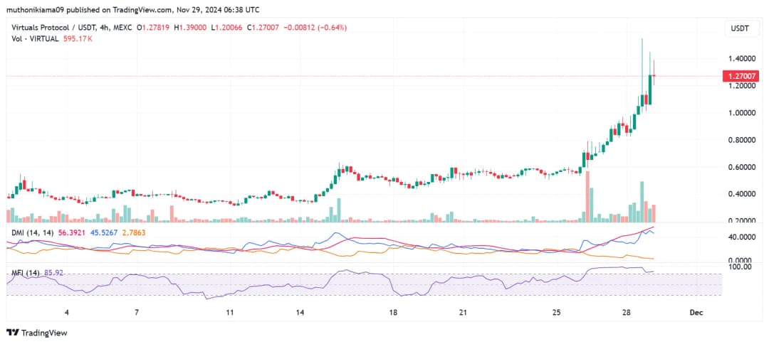 Virtuals Protocol (VIRTUAL) در ۲۹ نوامبر به اوج قیمت جدید ۱.۴۲ دلار رسید. در زمان نگارش این خبر، این توکن مبتنی بر هوش مصنوعی با کاهش جزئی به ۱.۲۹ دلار معامله میشود و در ۲۴ ساعت گذشته ۴۲٪ افزایش داشته است. ارزش بازار آن نیز به ۱.۲۸ میلیارد دلار رسیده است. دادههای CoinMarketCap نشان میدهد که حجم معاملات VIRTUAL در ۲۴ ساعت بیش از ۱۰۰٪ افزایش یافته و به ۱۶۶ میلیون دلار رسیده است. این افزایش حجم معاملات احتمالاً به دلیل لیست شدن این آلتکوین در صرافی Bithumb بوده است، جایی که با جفتهای معاملاتی وون کره معامله میشود.