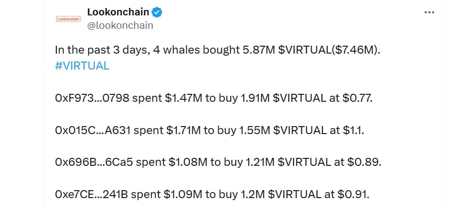 علاقه نهنگها به VIRTUAL نیز در چهار روز گذشته افزایش یافته است. طبق گزارش Lookonchain، چهار آدرس نهنگ در سه روز گذشته ۵.۸۷ میلیون توکن خریداری کردهاند.