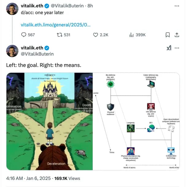 بوترین اشاره کرد که پست او در معرفی d/acc تنها «درخواستهای مبهمی برای عدم ساخت اشکال خطرناک هوش مصنوعی فوقالعاده» داشت و میخواست نظرات خود را درباره چگونگی مقابله با سناریویی که در آن «خطر هوش مصنوعی بالا است» به اشتراک بگذارد.