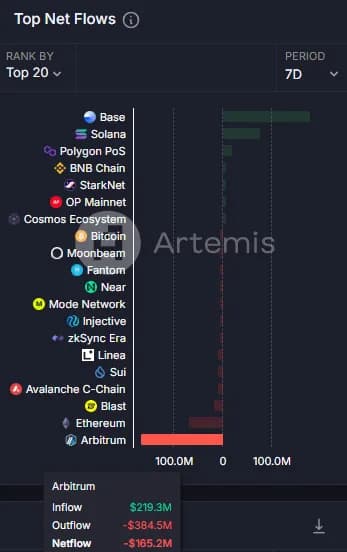 ARB با چالشی جدی مواجه است، زیرا در هفت روز گذشته بزرگترین جریان خالص منفی زنجیره را ثبت کرده و از اتریوم، اولانچ، SUI و Injective پیشی گرفته است. دادههای Artemis نشان میدهد که جریان خالص زنجیره ARB به ۱۶۵.۲ میلیون دلار- رسیده که بیشترین خروجی ثبت شده در این دوره است.