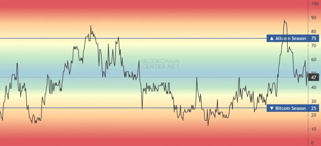 شاخص فصل آلتکوینها به ۴۷ کاهش یافته که نشاندهنده یک وضعیت خنثی است. تحلیل این معیار نشان میدهد که بازار نه به طور کامل در فصل بیت کوین است و نه در فصل آلتکوینها که عدم قطعیت فزاینده را نشان میدهد.