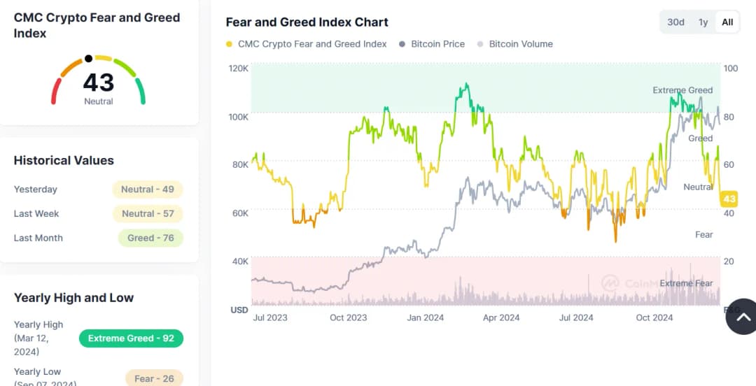 احساسات سرمایهگذاران به طور قابل توجهی کاهش یافته است. شاخص ترس و طمع اکنون در ۴۳ قرار دارد که کاهش شدیدی نسبت به ۷۶ ماه گذشته (نشاندهنده "طمع") دارد. این تغییر به یک وضعیت خنثی نشاندهنده احتیاط فزاینده در میان سرمایهگذاران است و نشان میدهد که ممکن است سودگیری در حال انجام باشد. به طور تاریخی، چنین تغییراتی در احساسات اغلب پیشدرآمدی برای افزایش نوسانات بازار و فروشهای احتمالی است.