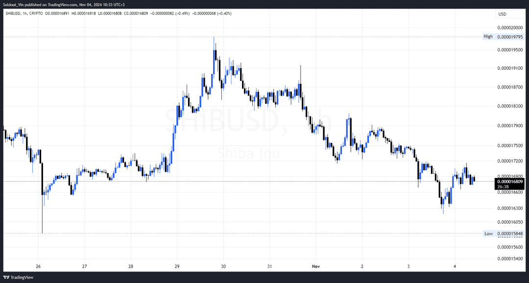 قیمت SHIB در حال حاضر ۰.۰۰۰۰۱۶۸۲ دلار است و در ۲۴ ساعت گذشته ۱.۴٪ کاهش یافته است. این در حالی است که قیمت بیت کوین کمی زیر ۶۸,۰۰۰ دلار معامله میشود و کل بازار کریپتو را ۱.۲٪ کاهش داده و به حدود ۲.۴ تریلیون دلار رسانده است.
