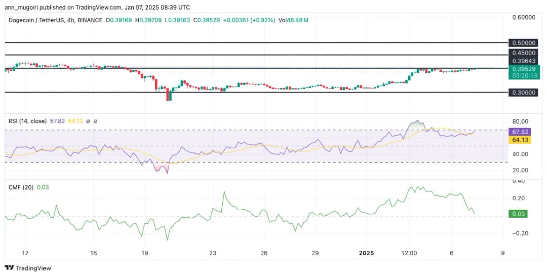 سطوح حمایتی در 0.35 و 0.32 دلار قرار دارند که در صورت فشار نزولی به عنوان یک پشتیبان عمل میکنند. اگر فروشندگان بازگردند، پیشبینی قیمت دوج کوین میتواند شاهد اصلاح بازار باشد. و اگر خریداران قدرت را حفظ کنند، دوج کوین میتواند سطح مقاومت روانی 0.50 دلار را آزمایش کند که یک سطح کلیدی برای صعود بیشتر است.