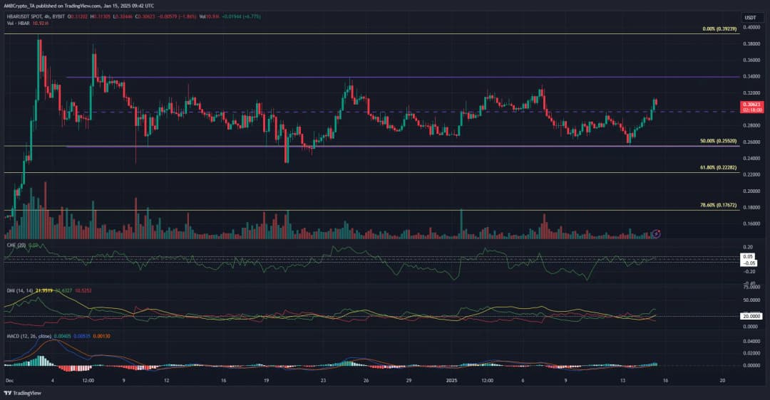 نمودار ۴ ساعته چالشهای پیش رو را واضحتر نشان میدهد. زیر مقاومت محدوده ۰.۳۴۴ دلار، منطقه ۰.۳۲ تا ۰.۳۲۴ دلار نیز مقاومت ایجاد کرده است. این همان جایی است که خریداران HBAR با رد قیمت مواجه شدند و قیمت مجبور شد محدودههای پایینتر را دوباره تست کند. با وجود افزایش تقریباً ۲۰ درصدی از کفهای قیمتی، CMF ورود سرمایه قابل توجهی را نشان نمیدهد. در واقع، MACD در هفتههای اخیر در اطراف سطح صفر خنثی بوده، اما یک کراس صعودی تشکیل داده تا مومنتوم صعودی را نشان دهد. علاوه بر این، DMI نشان میدهد که یک روند صعودی قوی در نمودار ۴ ساعته در حال شکلگیری است.