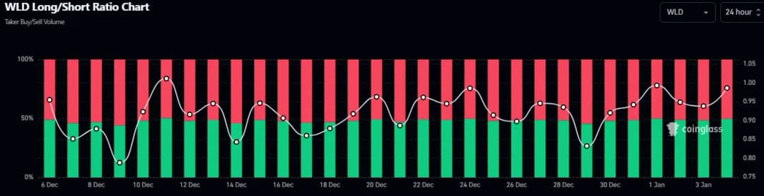 اگرچه کاهش اخیر در فعالیت نهنگها نگرانیهایی را ایجاد میکند، داستان پذیرش گستردهتر WLD میتواند همچنان برای سرمایهگذاران بلندمدت جذاب باشد. چشمانداز پروژه، علیرغم مشکلات، همچنان میتواند پس از حل چالشهای نظارتی، دوباره به حرکت درآید. در واقع، دادههای نسبت لانگ/شورت WLD از Coinglass نشاندهنده افزایش تدریجی این معیار از ۲۹ دسامبر بوده است. این موضوع نشان میدهد که دارندگان موقعیتهای خرید به آرامی کنترل را به دست میگیرند و میتواند بهبودی قیمت را در آینده نزدیک تقویت کند.