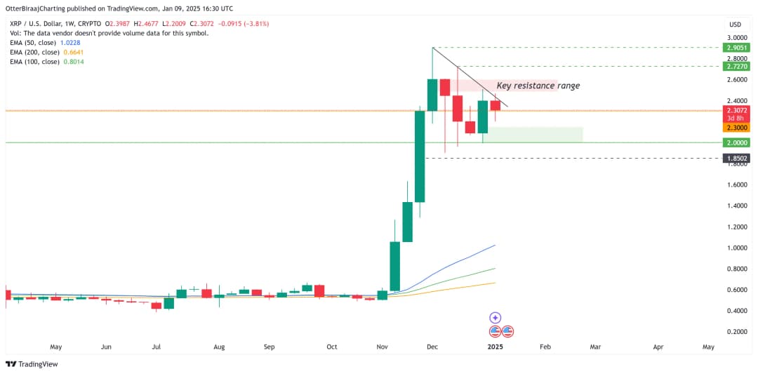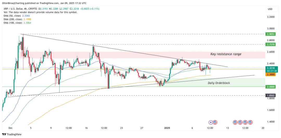XRP (XRP) مانند روند کلی بازار کریپتو، با فروش شدید مواجه شده است، اما این آلتکوین همچنان بخش عمدهای از افزایش ۳۰۰ درصدی خود را که در اواخر ۲۰۲۴ به دست آورده بود، حفظ کرده است. این آلتکوین توانست از اصلاح عمیقتر بین ۷ تا ۹ ژانویه جلوگیری کند و همچنان در نزدیکی خط روند نزولی خود در حال تثبیت است و به دنبال یک بریک اوت بالقوه بالاتر از محدوده مقاومت کلیدی ۲.۵۰ تا ۲.۶۰ دلار است.