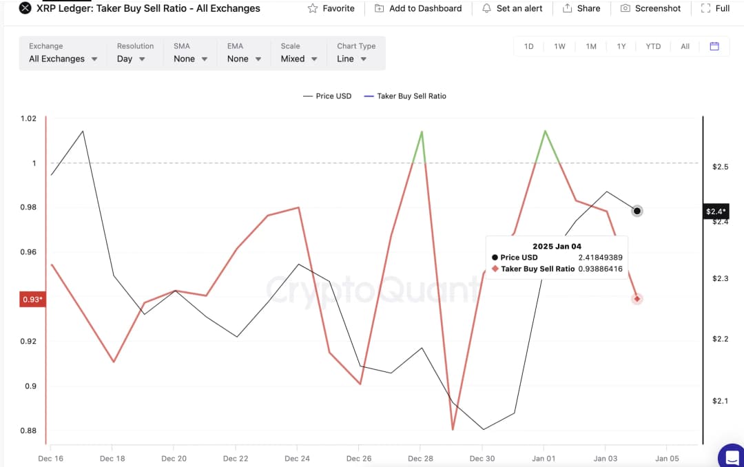 عدم عبور از مقاومت ۲.۵۰ دلاری در ۴ ژانویه، باعث کاهش مومنتوم صعودی در بازارهای XRP شده است. با این حال، دادههای بازار مشتقات نشان میدهد که از ۲ ژانویه، فشار فروش توسط دارندگان فعال افزایش یافته است. به طور مشخص، نسبت خرید/فروش تیکر CryptoQuant حجم سفارشات خرید را با فروش در نرخهای فعلی بازار مقایسه میکند. مقادیر کمتر از ۱ این نسبت، نشاندهنده تسلط فروشندگان است.