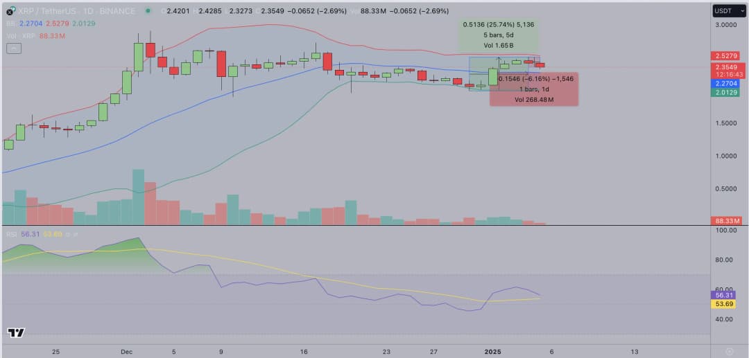 کاهش اخیر ۷ درصدی قیمت XRP ناشی از برداشت سریع سود بوده و نسبت خرید/فروش تیکر تا ۵ ژانویه به ۰.۹۳ کاهش یافته است. این امر نشاندهنده تسلط مداوم سفارشات فروش بر خرید در سه روز معاملاتی گذشته است که منجر به افزایش فشار نزولی شده است. اگر این عدم تعادل بین عرضه و تقاضا ادامه یابد، XRP ممکن است در کوتاهمدت با کاهش بیشتری مواجه شود. حجم معاملات به تدریج در حال کاهش است که نشاندهنده مشارکت ضعیف خریداران و فروشندگان است. شاخص قدرت نسبی (RSI) در حال کاهش و در سطح ۵۳.۶۹ قرار دارد که نشاندهنده پتانسیل نزولی بیشتر قبل از رسیدن به مناطق اشباع فروش است. در پیشبینی کوتاهمدت قیمت XRP، حمایت فوری در ۲.۲۷ دلار قرار دارد که با باند پایینی بولینگر همسو است. شکست این سطح حمایت کلیدی میتواند کاهش قیمت را به ۱.۸۵ دلار تمدید کند.