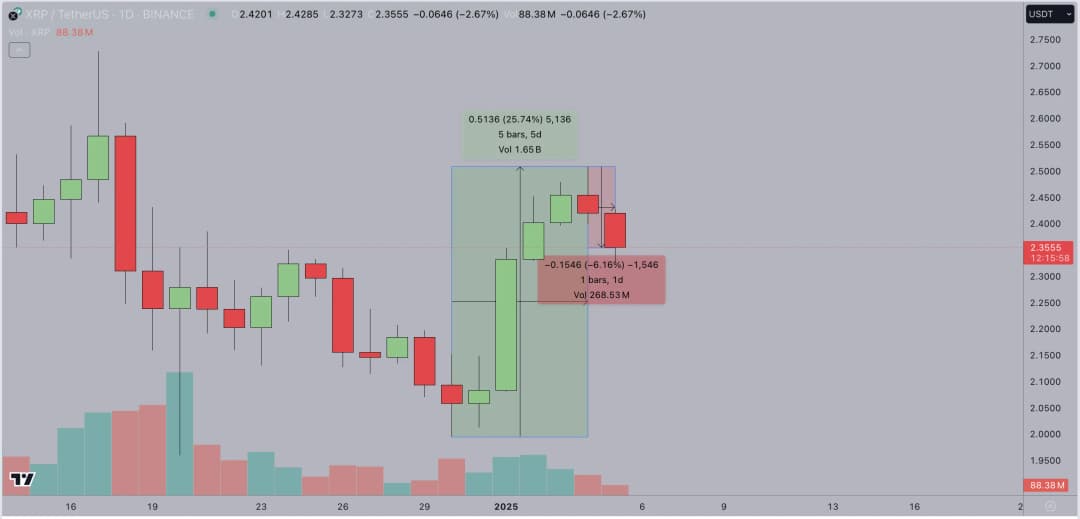 نمودار بالا نشان میدهد که قیمت XRP بین ۳۰ دسامبر تا ۴ ژانویه ۲۵ درصد افزایش یافت. اما پس از پنج روز صعود متوالی، نشانههای اولیه برداشت سود ظاهر شده و قیمت XRP در ۲۴ ساعت گذشته از ۲.۵۰ دلار به ۲.۳۳ دلار کاهش یافته است. با وجود اینکه احساسات کلی بازار کریپتو همچنان مثبت است، کاهش اخیر در حجم تراکنشهای XRP نشان میدهد که معاملهگران ممکن است سود خود را به داراییهای دیگر منتقل کنند.