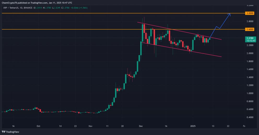 XRP دوباره به تیتر اخبار تبدیل شده است، زیرا قیمت آن در حال نزدیک شدن به یک بریک اوت بالقوه از کانال نزولی خود است و خوشبینیها را برانگیخته است. در زمان نگارش این مطلب، این آلتکوین با افزایش ۱.۵۶ درصدی در ۲۴ ساعت گذشته، با قیمت ۲.۳۷۸ دلار معامله میشد. این حرکت پس از هفتهها تثبیت قیمت رخ داده و امید معاملهگران را برای یک روند صعودی پایدار افزایش داده است. با این حال، XRP باید از سطوح مقاومت حیاتی نزدیک به ۲.۶۰ دلار عبور کند تا چشمانداز صعودی خود را تأیید کند.