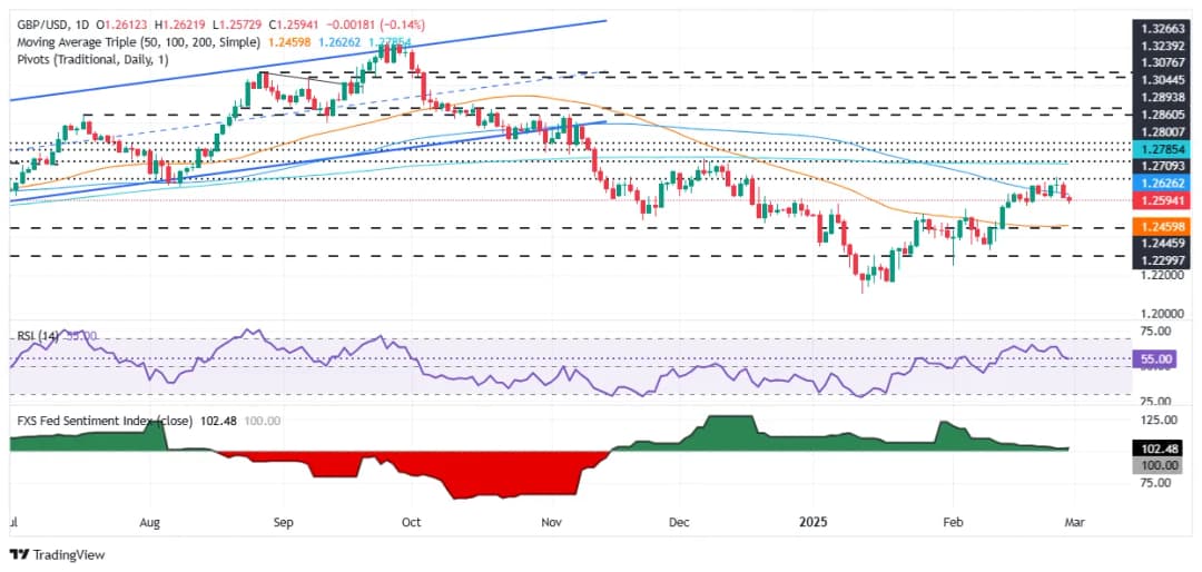 برای ادامه افزایش، خریداران باید سطح ۱.۲۷۰۰ را پشت سر بگذارند و سپس میانگین متحرک ساده ۲۰۰ روزه (SMA) در ۱.۲۷۸۵ را فتح کنند. افزایشهای بیشتر بالای ۱.۲۸۰۰ دیده میشود. در مقابل، اگر فروشندگان مانع از بسته شدن روزانه بالای ۱.۲۶۰۰ شوند، این میتواند راه را برای آزمایش اوج روزانه ۵ فوریه در ۱.۲۵۴۹ هموار کند. در صورت عبور از این سطح، فروشندگان میتوانند میانگین متحرک ساده ۵۰ روزه در ۱.۲۴۵۷ را به چالش بکشند.