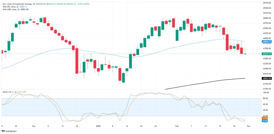 داوجونز همچنان به سمت کاهش حرکت میکند و زیر میانگین متحرک نمایی ۵۰ روزه (EMA) در نزدیکی ۴۳,۸۴۰ معامله میشود. این شاخص همچنان بالاتر از EMA ۲۰۰ روزه در سطح ۴۲,۰۰۰ قرار دارد، اما روند صعودی آن در حال کاهش است.