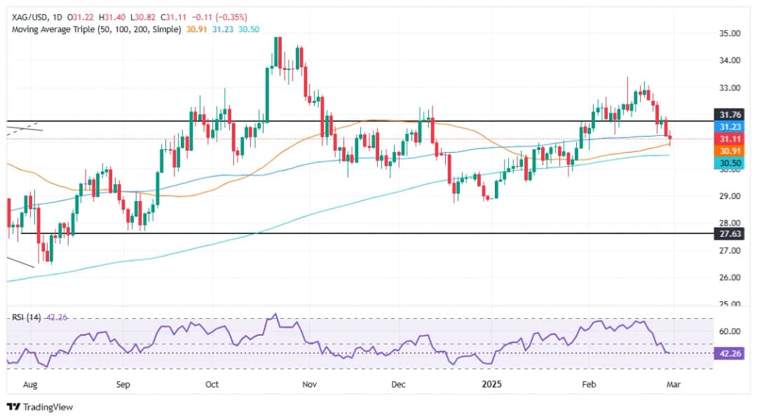 این فلز خاکستری پس از عدم عبور قاطع از سطح ۳۳.۰۰ دلار در بسته شدن روزانه، نشانههایی از تثبیت نشان داده بود که میتوانست باعث افزایش قیمت به سمت ۳۴.۰۰ دلار شود. در عوض، قیمت لحظهای XAG/USD میانگین متحرک ساده ۱۰۰ روزه (SMA) در ۳۱.۲۰ دلار را پشت سر گذاشت و راه را برای آزمایش میانگین متحرک ساده ۵۰ روزه (SMA) در ۳۰.۸۹ دلار باز کرد.