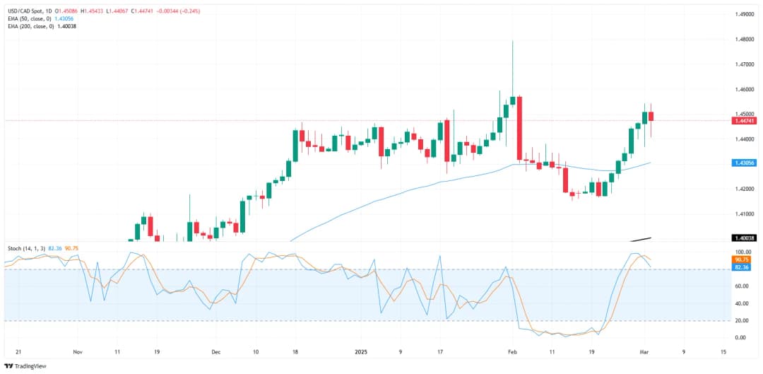 دلار کانادا در روز سهشنبه دچار نوسان شده و بیثباتی افزایش یافته است. تعرفههای ۲۵ درصدی رئیسجمهور آمریکا، دونالد ترامپ، بر کالاهای کانادایی از روز سهشنبه آغاز شده است. جفت ارز USD/CAD نزدیک به سطح ۱.۴۵۰۰ باقی مانده است، در حالی که یک جمعه دیگر با گزارش اشتغال غیرکشاورزی (NFP) در پیش است.