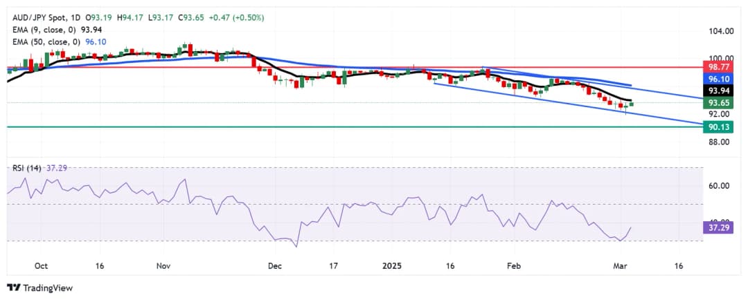 AUD/JPY برای دومین روز متوالی به افزایش خود ادامه میدهد و در ساعات آسیایی روز چهارشنبه در حدود ۹۳.۶۰ معامله میشود. با این حال، بررسی تکنیکال نمودار روزانه نشان میدهد که این جفت ارز همچنان در یک کانال نزولی قرار دارد که نشاندهنده تمایل نزولی پایدار است. شاخص قدرت نسبی (RSI) ۱۴ روزه بالای سطح ۳۰ باقی مانده و تمایل نزولی غالب را تقویت میکند. علاوه بر این، این جفت ارز همچنان زیر میانگین متحرک نمایی ۹ روزه معامله میشود که نشاندهنده ضعف حرکت قیمت در کوتاهمدت است.