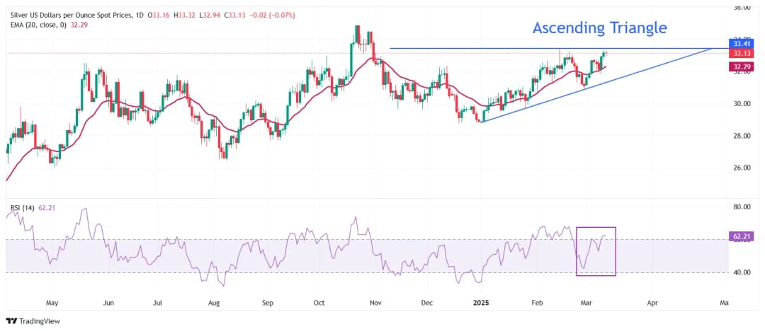قیمت نقره نزدیک به مرز افقی الگوی نموداری مثلث صعودی در بازه زمانی روزانه معامله میشود که از بالاترین سطح ۱۴ فوریه ۳۳.۴۰ دلار قرار دارد. مرز صعودی از پایینترین سطح ۳۱ دسامبر ۲۸.۷۸ دلار قرار دارد. الگوی نموداری مذکور نشاندهنده عدم تصمیمگیری در میان فعالان بازار است.