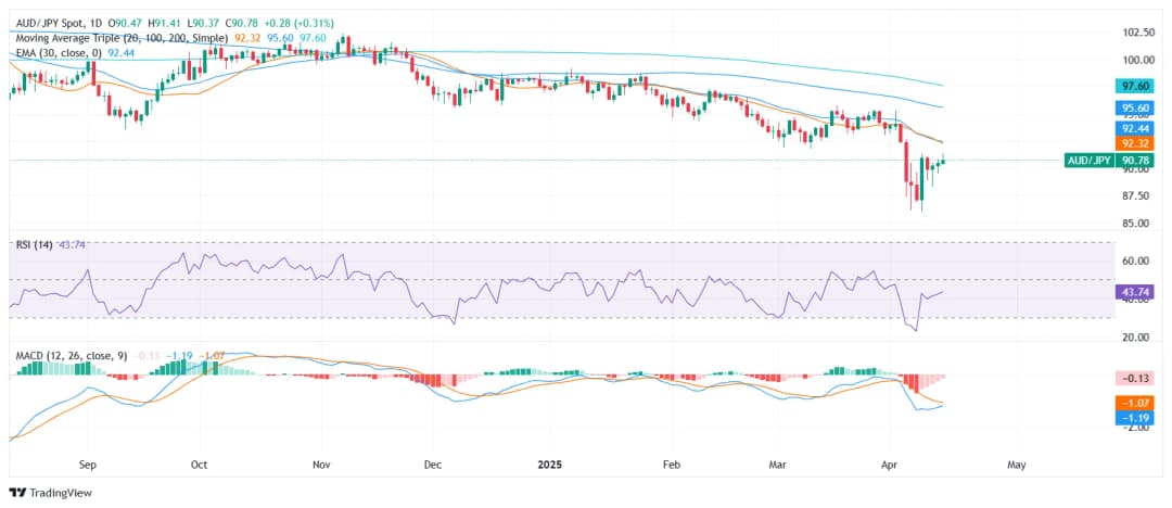 جفت ارز AUD/JPY در نزدیکی منطقه 90.90 معامله میشود و پس از افزایشهای اندک در جلسه سهشنبه، به این سطح نزدیک شده است. با وجود قدرتهای درون روز، شاخصها و میانگینهای متحرک دید نزولی را تقویت میکنند.