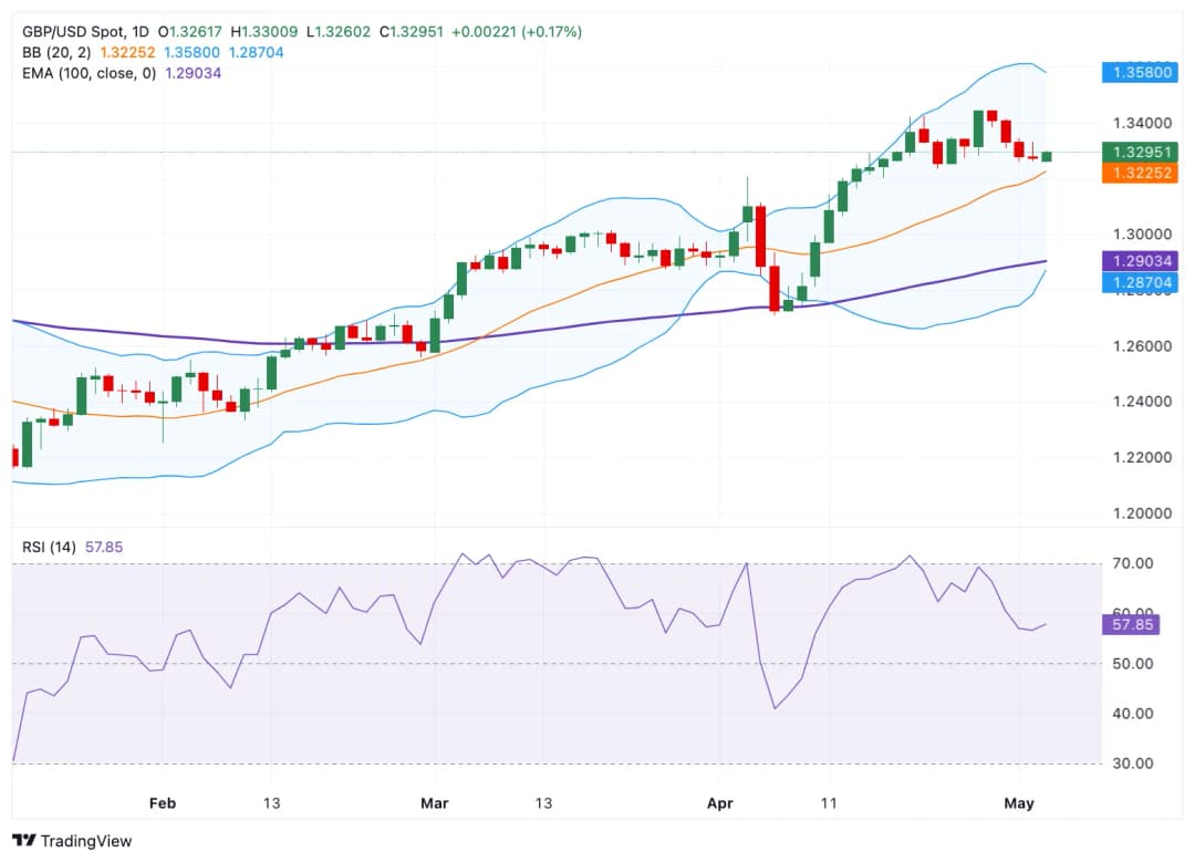 جفت ارز GBP/USD در آغاز جلسه معاملاتی اروپا در روز دوشنبه تا حدود 1.3290 پیشروی کرد. ارزش دلار آمریکا در برابر پوند استرلینگ کاهش یافت که ناشی از افزایش عدمقطعیت اقتصادی به دنبال سیاستهای تجاری نامنظم رئیسجمهور ترامپ است. بر اساس نمودار روزانه، چشمانداز صعودی GBP/USD همچنان پا برجا است؛ چرا که قیمت بالاتر از میانگین متحرک نمایی 100 روزه قرار دارد. شتاب صعودی با شاخص قدرت نسبی 14 روزه که بالای خط میانی و حدود 55.60 ایستاده است، حمایت میشود و نشان میدهد کمترین مقاومت به سمت بالا خواهد بود.