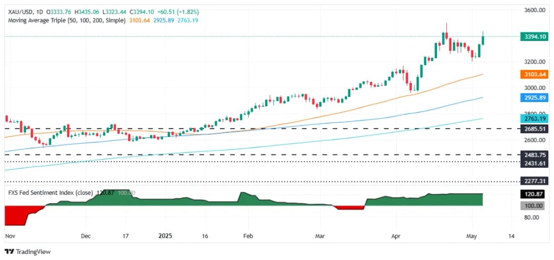 در زمان نگارش این گزارش، هر انس طلا (XAU/USD) حوالی ۳۴۰۰ دلار معامله میشود و بیش از ۲.۷۰٪ رشد کرده است.