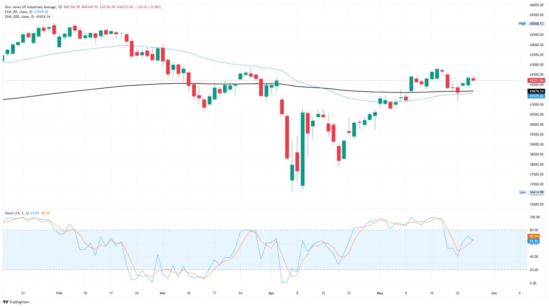عملکرد قیمتی داو جونز همچنان در محدوده نزدیکمدت گیر کرده و با وجود تثبیت بالای میانگین متحرک نمایی ۲۰۰ روزه در حوالی ۴۱٬۶۵۵، هنوز فاصله زیادی تا رکورد بالای ۴۵٬۰۰۰ واحد دارد.