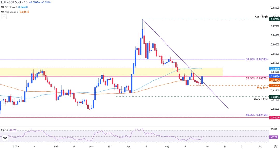 علاوه بر این، به نظر میرسد اختلاف سیاستهای پولی بین اروپا و بریتانیا در حال کاهش است. بر اساس نظرسنجی اخیر رویترز، ۷۰٪ اقتصاددانان پیشبینی کردهاند که بانک مرکزی اروپا (ECB) در ژوئن بار دیگر نرخ بهره را ۲۵ واحد پایه (۰٫۲۵٪) کاهش دهد و سپس نرخها ثابت باقی بمانند. با وجود دادههای اخیر منطقه یورو که این هفته هشدار دادهاند اقتصاد تحت فشار است، سطوح تکنیکال عامل کاتالیزور اضافی برای جفت EUR/GBP شدهاند.