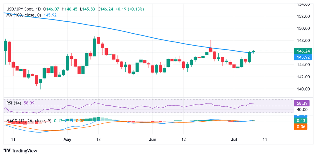 از دیدگاه تکنیکال، جفت ارز USD/JPY موفق شده است بالاتر از میانگین متحرک ساده ۱۰۰ روزه تثبیت شود و اندیکاتورهای روزانه سیگنال مثبتی دارند. اگر روند خرید از سقف ثبت شده در دوره آسیایی (منطقه ۱۴۶.۴۵) ادامه یابد، قیمت میتواند تا سطح ۱۴۷.۰۰ و سپس ۱۴۷.۶۰ و در نهایت سقف ماه ژوئن حوالی ۱۴۸.۰۰ پیشروی کند.